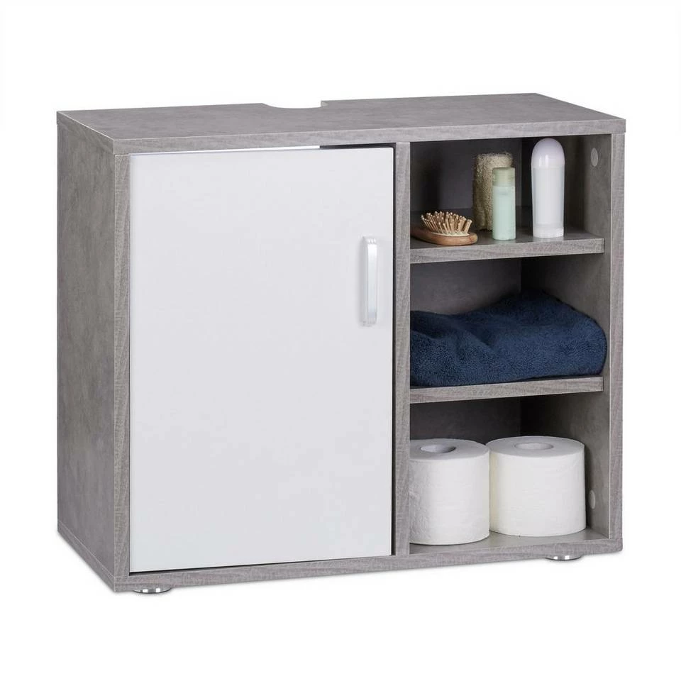 Moderner Waschbeckenunterschrank Mit dem Waschbeckenunterschrank können Sie nicht nur benötigte Putzmittel in dem hohen Türfach unterbringen, sondern auch die offenen Ablagen sinnvoll nutzen. Diese sind perfekt für wichtige Badutensilien wie Handtücher und Klopapier, die griffbereit seien sollten. Durch die 4 Füße ist der Schrank vor kleinen Pfützen geschützt, die öfters mal beim Baden oder Duschen entstehen. Die Aussparung an der Rückseite ist ausreichend für gängige Siphons. Bei besonders tiefen Siphons können Sie auch die kleine Rückwand-Platte weglassen. Der Badschrank kommt in modernen Farben.